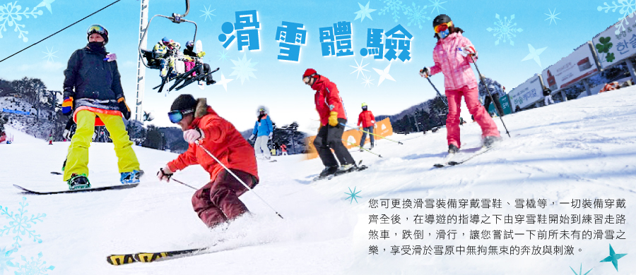 首先將由導遊傳授滑雪基本知識及滑雪所應注意之事項、動作等,而後展開一系列的飆雪活動,充份享受雪中活動的樂趣。滑雪場設備完善,也依不同滑雪程度的人設計了陂度不同的滑道,簡單區分為初、中、高等三級,您可挑戰不同層級,一展您的滑雪長才。