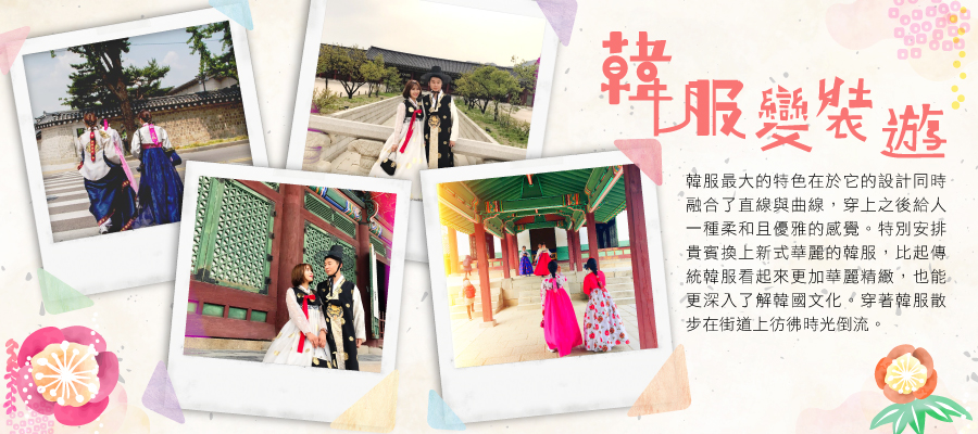 讓您體驗親自穿著傳統韓國服飾時的不一樣感覺,換上古代傳統的韓服,韓服的線條兼具曲線與直線之美,尤其是女式韓服的短上衣和長裙上薄下厚,端莊閑雅,透露著東方思想和超世脫俗之美的完美結合;穿著韓服悠閒漫步穿梭在宮闕中,就有如是穿越到古代一樣,隨意自由的捕捉美麗的倩影,留下永恆回憶。