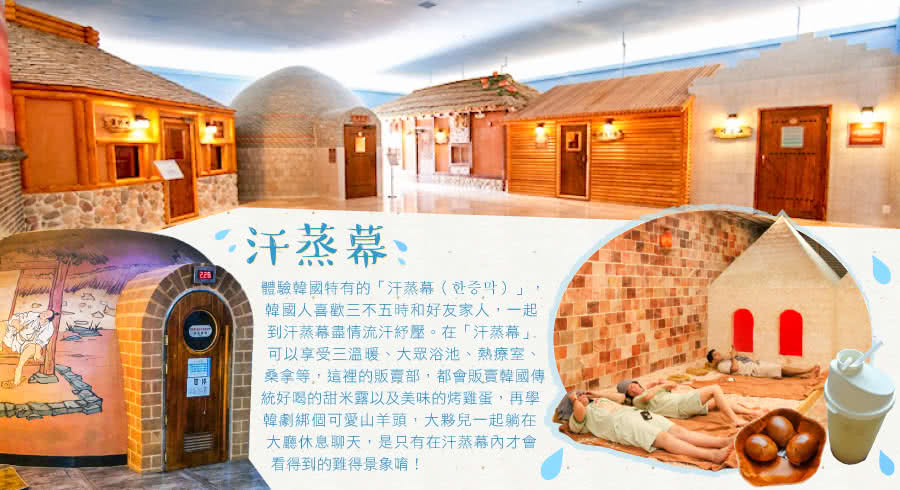 「汗蒸(찜질)」指的是將身體置於熱水或熱沙中,透過流汗來治病的方法,汗蒸幕是將韓國大眾浴池與可以汗蒸的熱療室相結合的設施。將使用黃土、優質木炭、鹽等設製而成的熱療汗蒸室加熱至40∼80℃,進入房間內讓身體流汗,可以緩解積累的疲勞,使皮膚變得光潤。