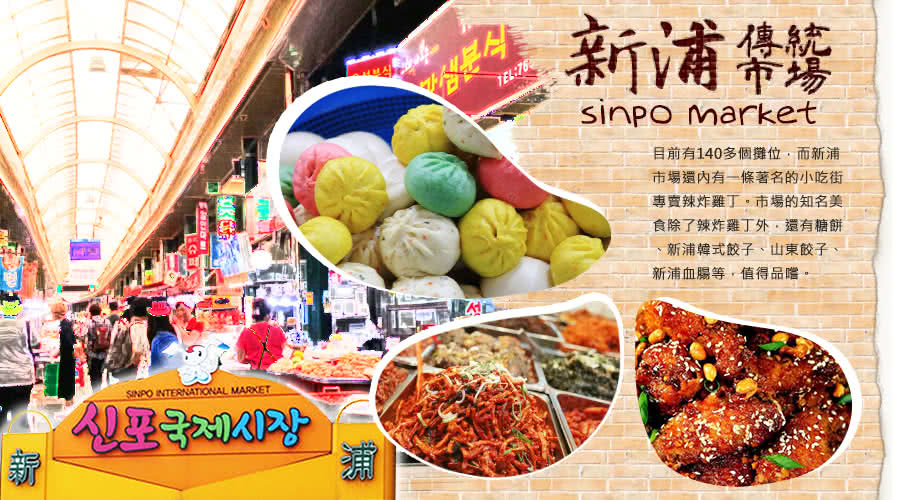 新浦市場在日據時代已有小規模的攤位聚集現象,直到1970年才正式登記為市場,目前有140多個攤位入駐,而新浦市場還內有一條著名的小吃街專賣辣炸雞丁(雞肉經過油炸後沾上當地特殊醬料的料理)。市場的知名美食除了辣炸雞丁外,還有糖餅、新浦韓式餃子、山東餃子、新浦血腸等,值得品嚐。