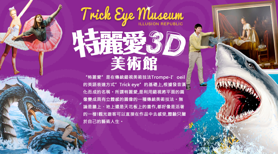“特麗愛”是在傳統錯視美術技法Trompe-I’oeil的英語表達方式”Trick eye”的基礎上,根據發音漢化而成的名稱。所謂特麗愛,是利用錯視將平面的圖像變成具有立體感的圖像的一種傳統美術技法。無論是牆上、地上還是天花板上的畫作,都好像是活著的一樣!觀光遊客可以直接在作品中去感受,體驗只屬於自己的藝術人生。