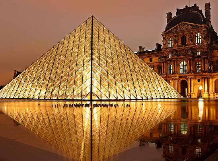 羅浮宮。原是12世紀時為鞏固塞納河的險要位置而建成的要塞,現已是蒐集世界名畫、雕塑古物之藝術寶庫。在博物館導遊陪同下,聆聽導遊解說鎮館三寶~蒙娜麗莎的微笑、米羅的維納斯和勝利女神像,讓您一窺藝術殿堂之奧妙。當然您可在「達文西密碼」電影中男主角走過的倒金字塔旁,仔細看個夠,親身了解玻璃帷幕和三角幾何的奧秘。