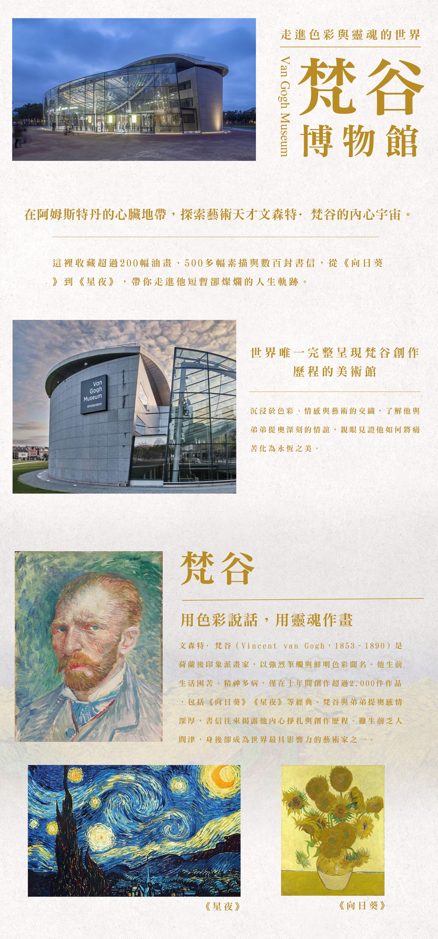 位於阿姆斯特丹的梵谷博物館藏有全世界最豐富、齊全的梵谷作品,總計逾200幅畫作,從梵谷標誌性的《向日葵》、《黃房子》、《卧室》到《麥田群鴉》等精彩的真跡畫作,還有機會目睹梵谷的親筆書信,每年吸引藝術愛好者從世界各地前來朝聖。想要深入了解梵谷,就必須從不同時期、主題的畫作多方探尋,不論是《盛開的杏花》,或者是其著名的自畫像,必須從時代背景、作者際遇等不同角度,才能夠真正地欣賞道奇畫作的精神。